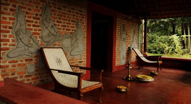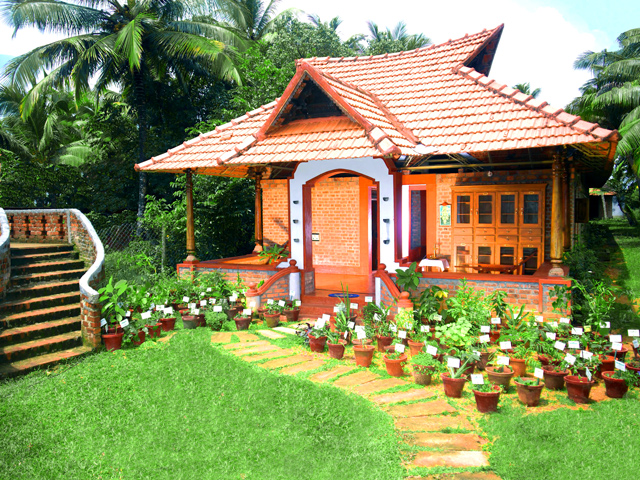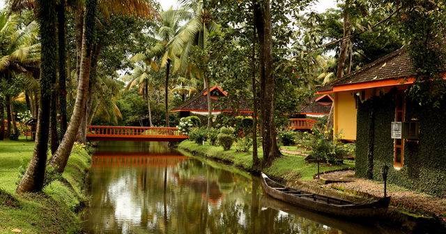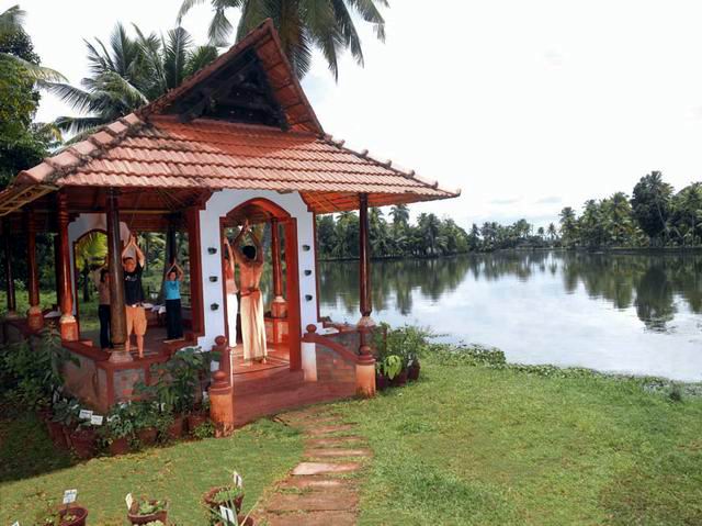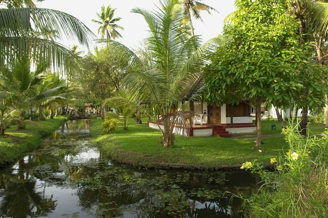 L'AYURTHEERAM AYURVEDIC RESORT se situe sur un domaine de 7 hectares en bordure des backwaters, non loin du lac Vembanad à Kumarakom, il porte aussi le nom de GOLDEN WATERS. On y accède en bateau, ou en voiture. Les bungalows, au nombre de 28 sont installés au bord des canaux, parfois à cheval sur l'un d'entre eux, et sont confortables et climatisés. |