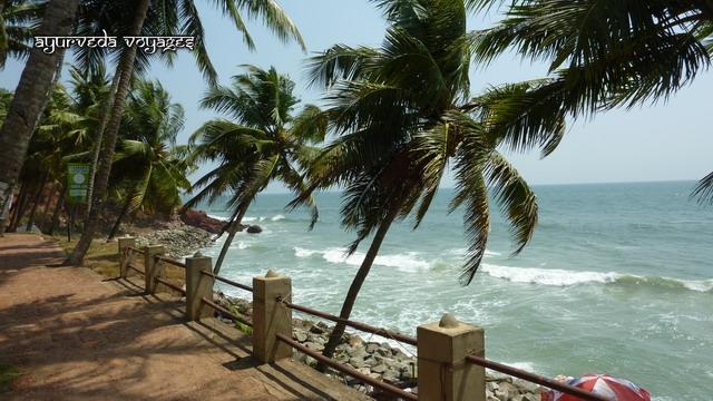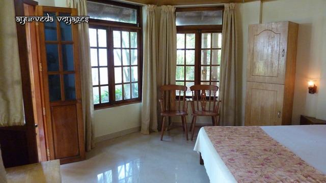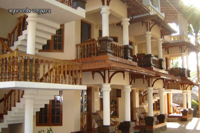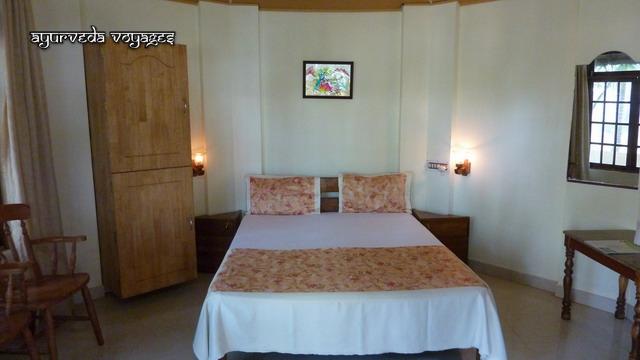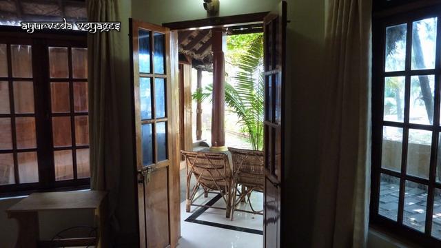 Le WOOD HOUSE BEACH RESORT se trouve sur la falaise nord de Varkala, à quelques mètres du Krishnatheeram. Le chemin côtier qui sinue le long de cette falaise, après être passé devant le Krishnatheeram, passe par un chapelet de petites échoppes, restaurants, tailleurs, cafés, tous très touristiques, très "vacances". De l'autre côté du chemin, vers le nord, en trois minutes on se trouve au bord d'une plage où habitent des pêcheurs., puis une longue ballade côtière sous les cocotiers, éloignée des touristes. Le resort est une petite unité : 10 chambres dansle bâtiment principal (dont 6 climatisées) et 4 cottages (sans clim). Il y a trois salles de soins au dernier étage du bâtiment, très propres et bien équipées, d'où 'on a une très belle vue. A partir de la fin juillet 2010, le nouveu restaurant (et sa cuisine) sera construit, et la terrasse au bord de l'eau, en contrebas, ne sera plus le seul endroit pour déjeuner à plusieurs. Actuellement, les repas ayurvédique sont soit portés dans les chambres, soit sur cette terrasse. Les soins sont de bon niveau, et le personnel est serviable et agréable.