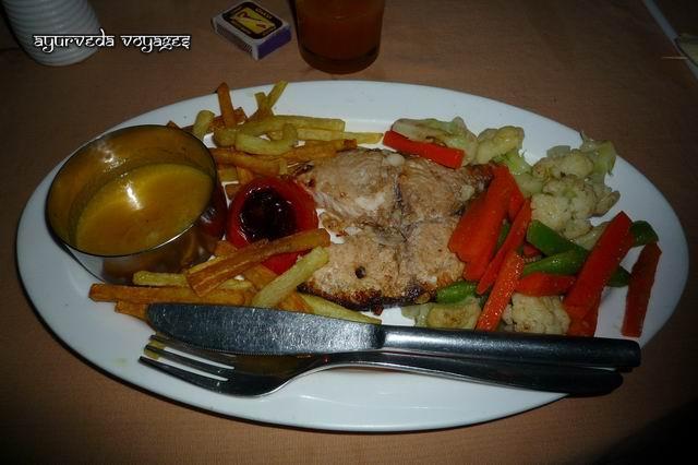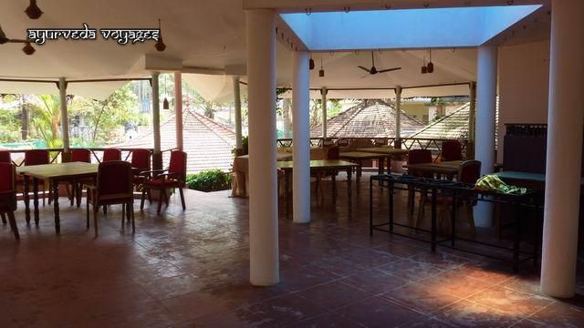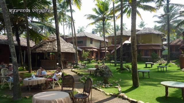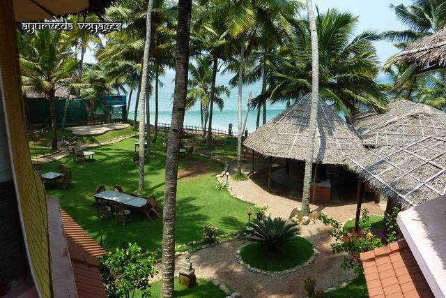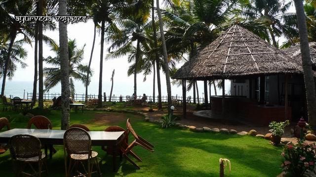 Le restaurant est en plein air sur la pelouse, mais quand il pleut - surtout pendant la mousson - il y a un autre restaurant au premier étage qui surplombe le jardin et la mer. |